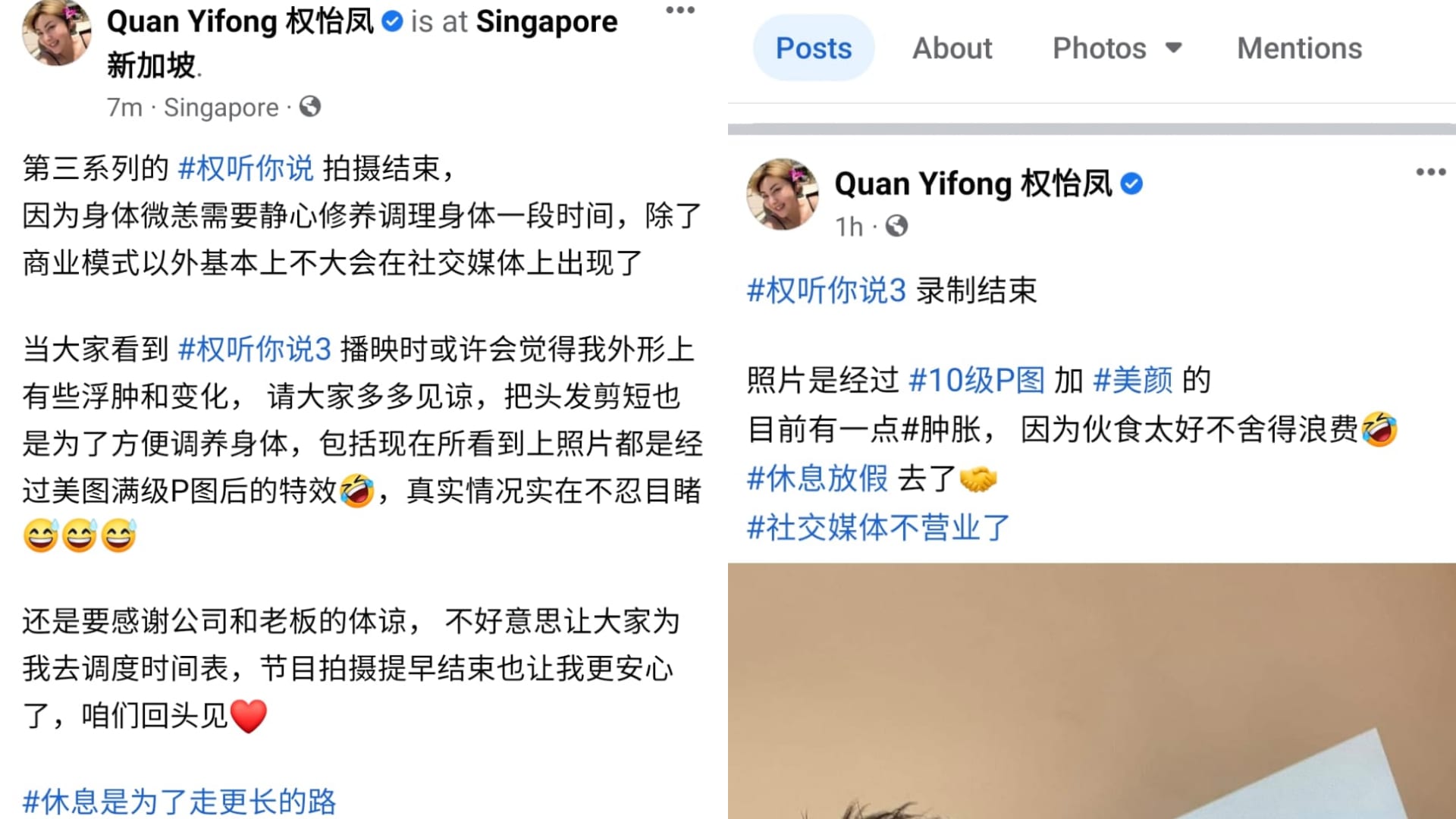 After wrapping up filming for the third season of "Hear U Out", Quan Yifong is taking a break from social media. In her announcement post, the host addresses the cause of her bloated appearance.